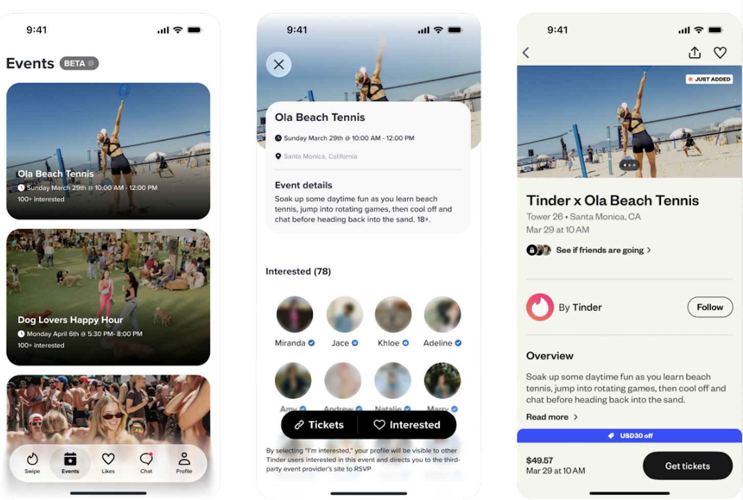 Events is built to complement Tinder’s core matching experience, creating more ways for connections to come to life beyond the screen.